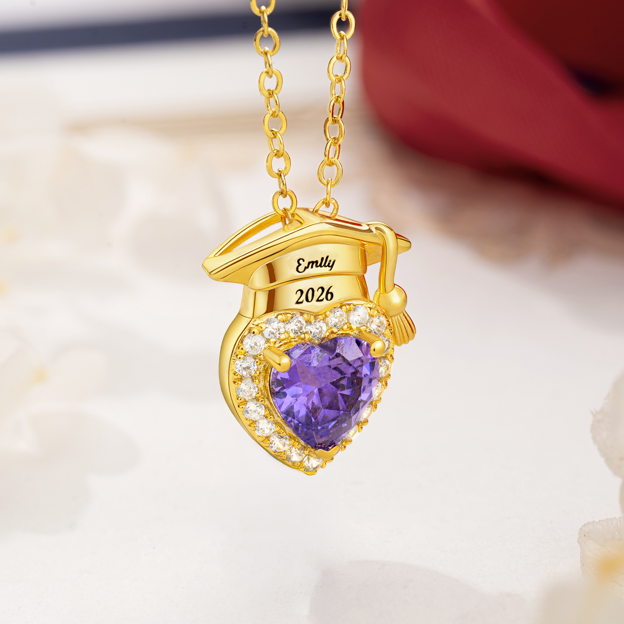 Custom Grad Cap Heart Design - This elegant pendant showcases a personalized graduation cap engraved with a name and graduation year, resting above a heart-shaped frame that holds a bright heart-shaped birthstone. The thoughtful design represents achievement, love, and pride, creating a meaningful keepsake to celebrate an important milestone.