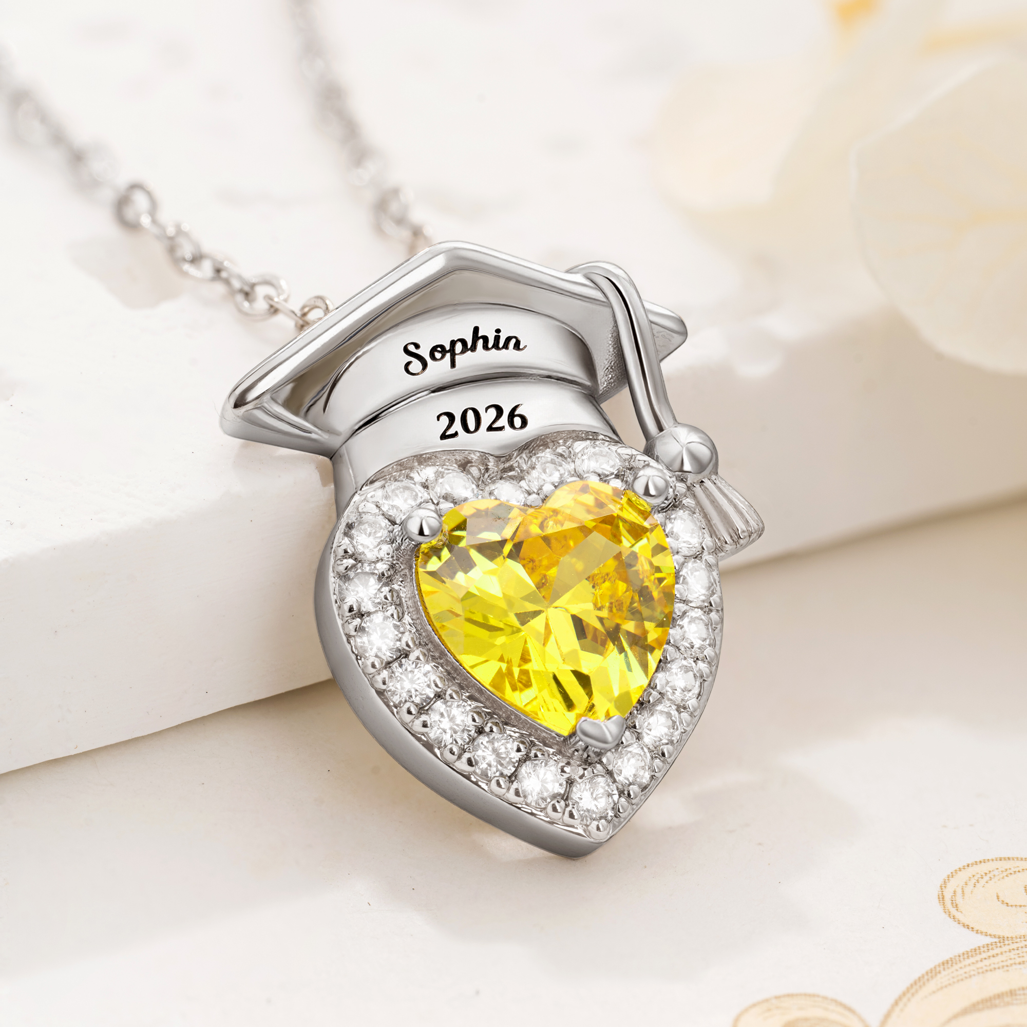 Style Personalized Name Graduation Cap Necklace with Heart Birthstone